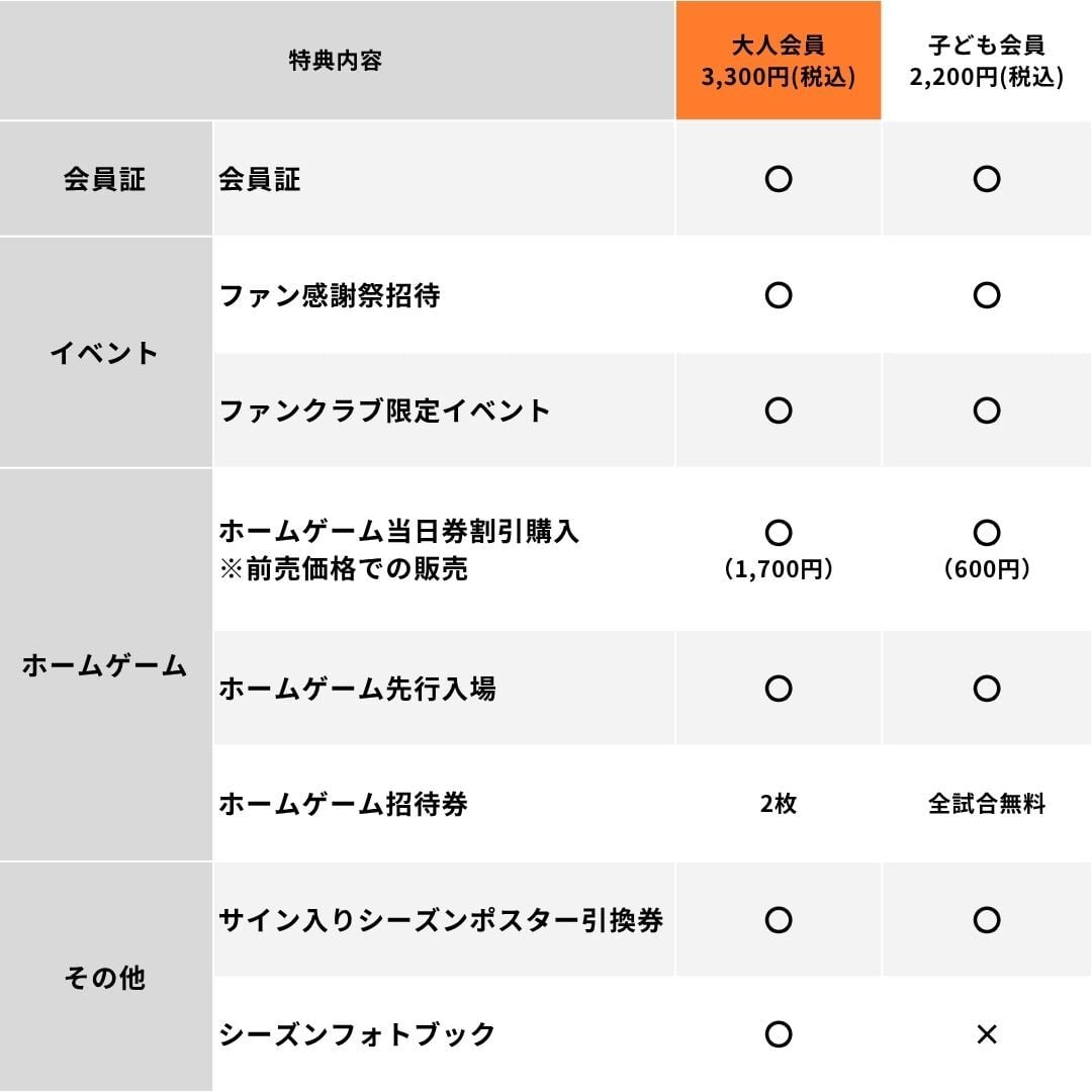 試合観戦:ホームゲーム当日券割引販売(前売価格での販売)、ホームゲーム全試合無料招待(第18節湘南戦(共同開催)を除く)、ホームゲーム先行入場